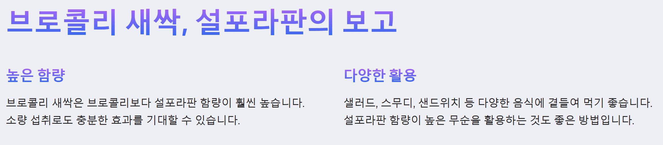 브로콜리 새싹은 설포라판 함량이 특히 높은 것으로 알려져 있습니다. 브로콜리 새싹에는 브로콜리보다 훨씬 많은 양의 설포라판이 함유되어 있어, 적은 양으로도 충분한 효과를 볼 수 있습니다.