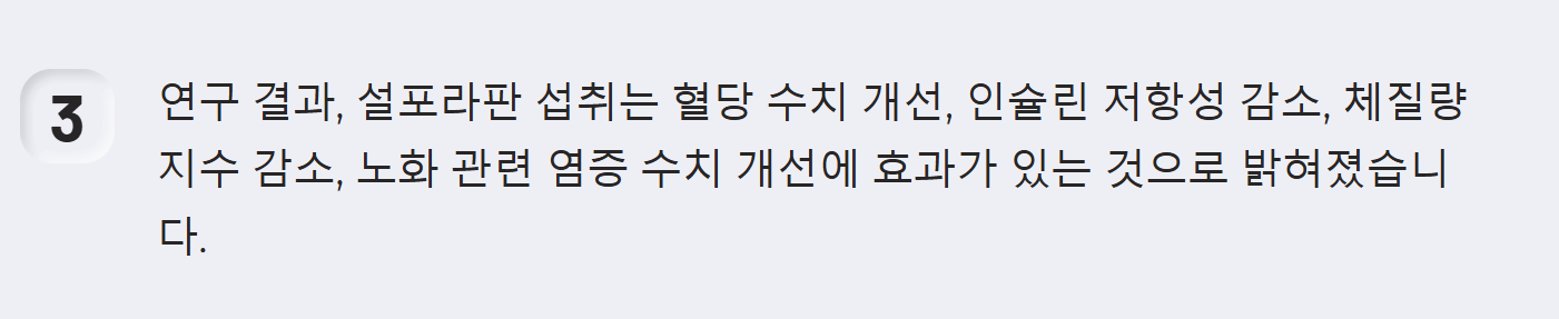 스웨덴 예테보리대 연구팀은 과체중 또는 비만이고 공복혈당장애가 있는 성인 74명을 대상으로 12주간 설포라판 화합물 또는 위약을 섭취하게 했습니다. 그 결과, 설포라판 섭취군은 대조군보다 공복혈당이 3.6~7.2mg/dL 감소했으며, 인슐린 저항성, 체질량지수, 노화 관련 염증 수치 등도 낮아진 것으로 확인되었습니다.