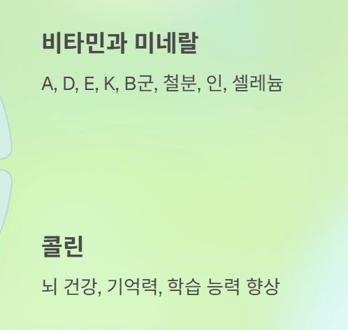 - 콜린: 달걀은 뇌 건강에 필수적인 영양소인 콜린의 훌륭한 공급원입니다. 콜린은 신경 전달 물질인 아세틸콜린의 합성에 관여하여 기억력과 학습 능력 향상에 도움을 줄 수 있으며, 간 기능 유지에도 중요한 역할을 합니다.