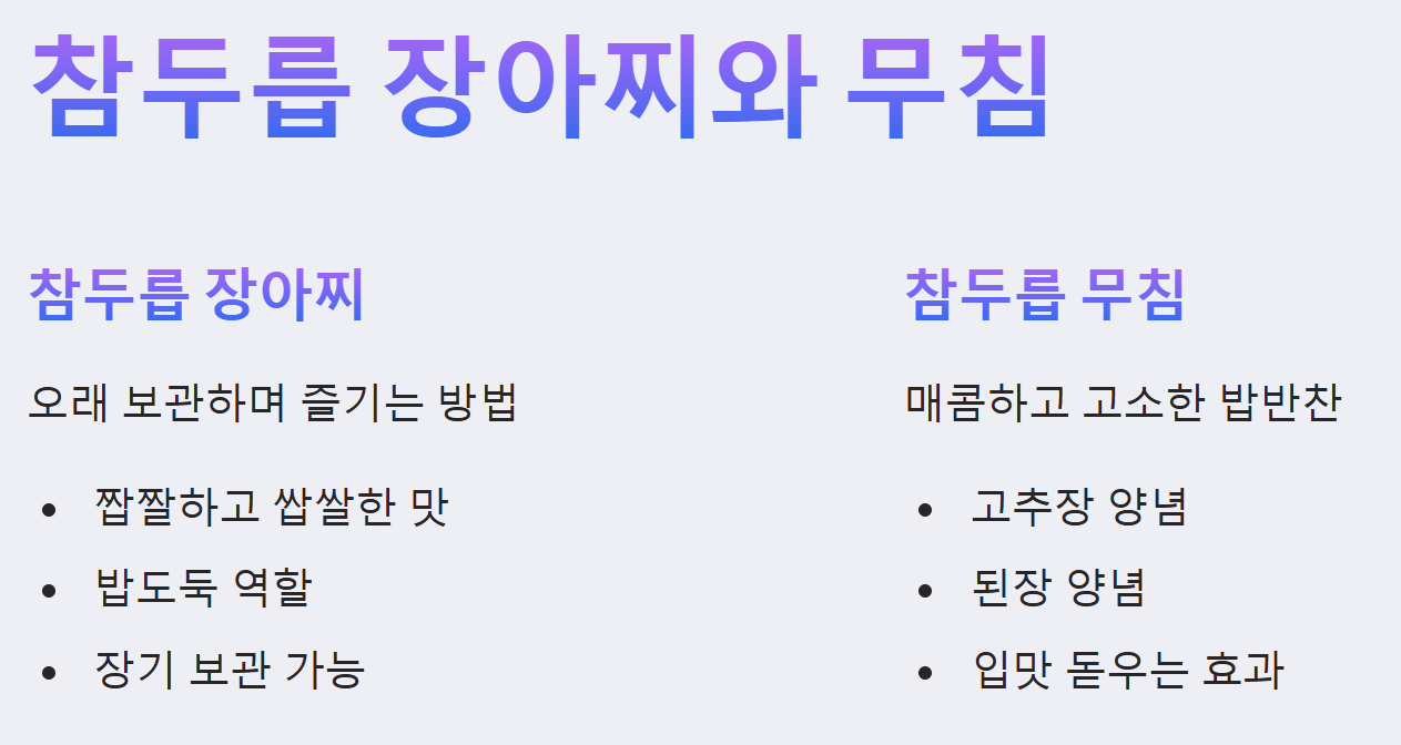 - 참두릅 장아찌: 봄에 채취한 참두릅을 장아찌로 담가두면 오랫동안 보관하며 즐길 수 있습니다. 짭짤하면서도 쌉쌀한 맛이 밥도둑 역할을 톡톡히 합니다.