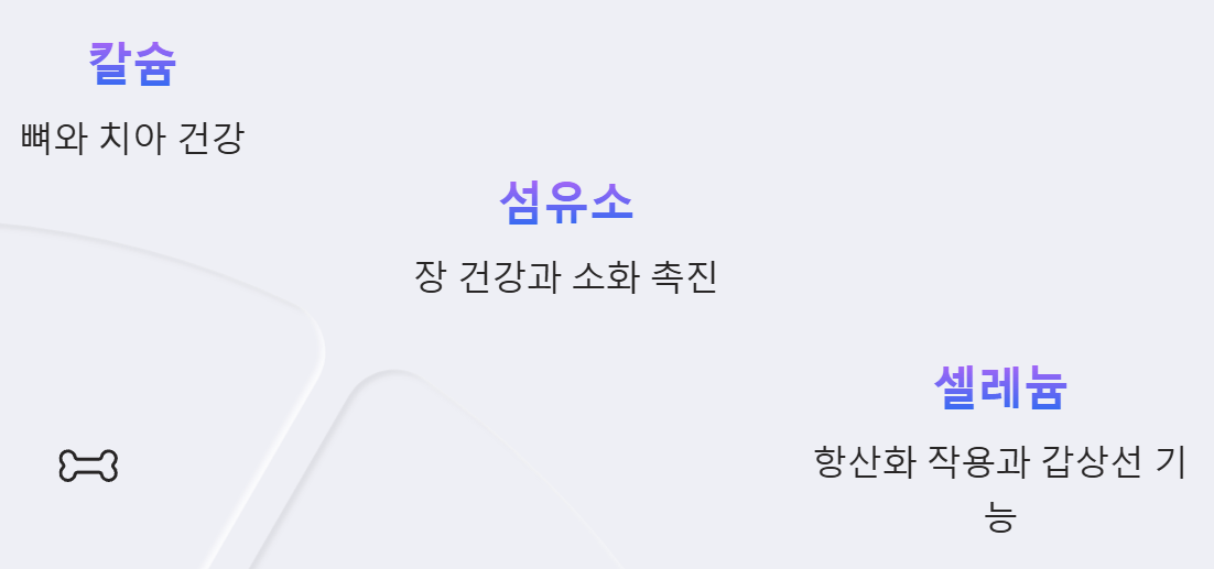 - 칼슘: 뼈와 치아를 튼튼하게 유지하고, 신경 및 근육 기능 조절에 필요합니다.