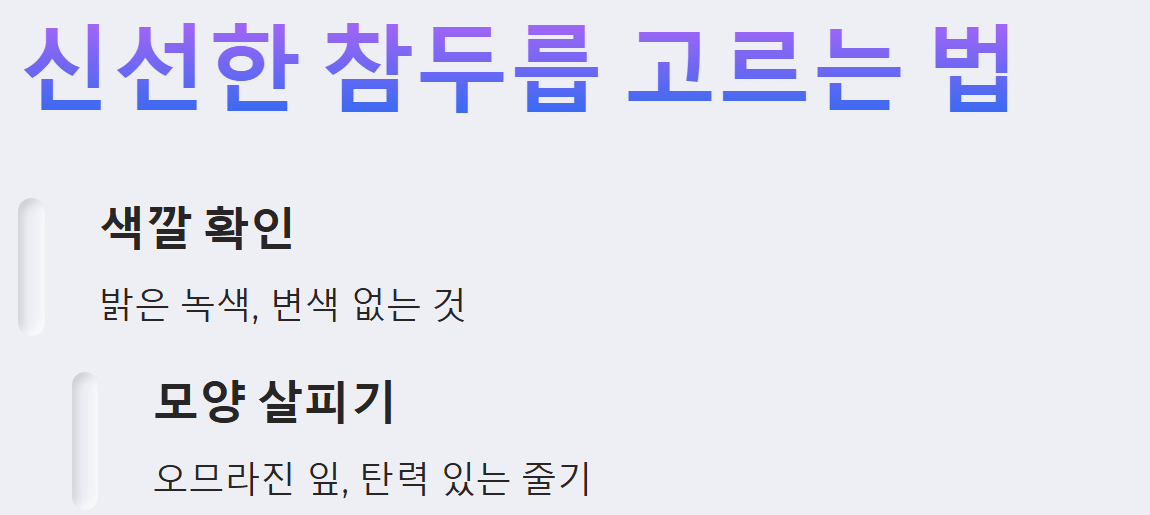 - 색깔: 밝은 녹색을 띠고, 갈색이나 검은색으로 변색된 부분이 없는 것을 고릅니다.