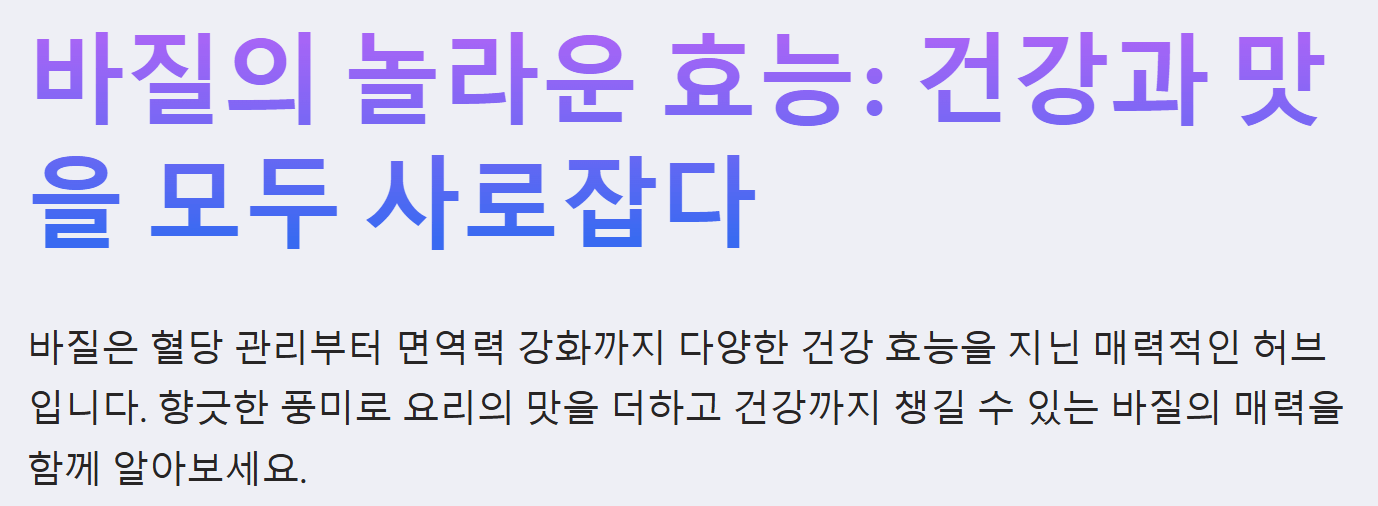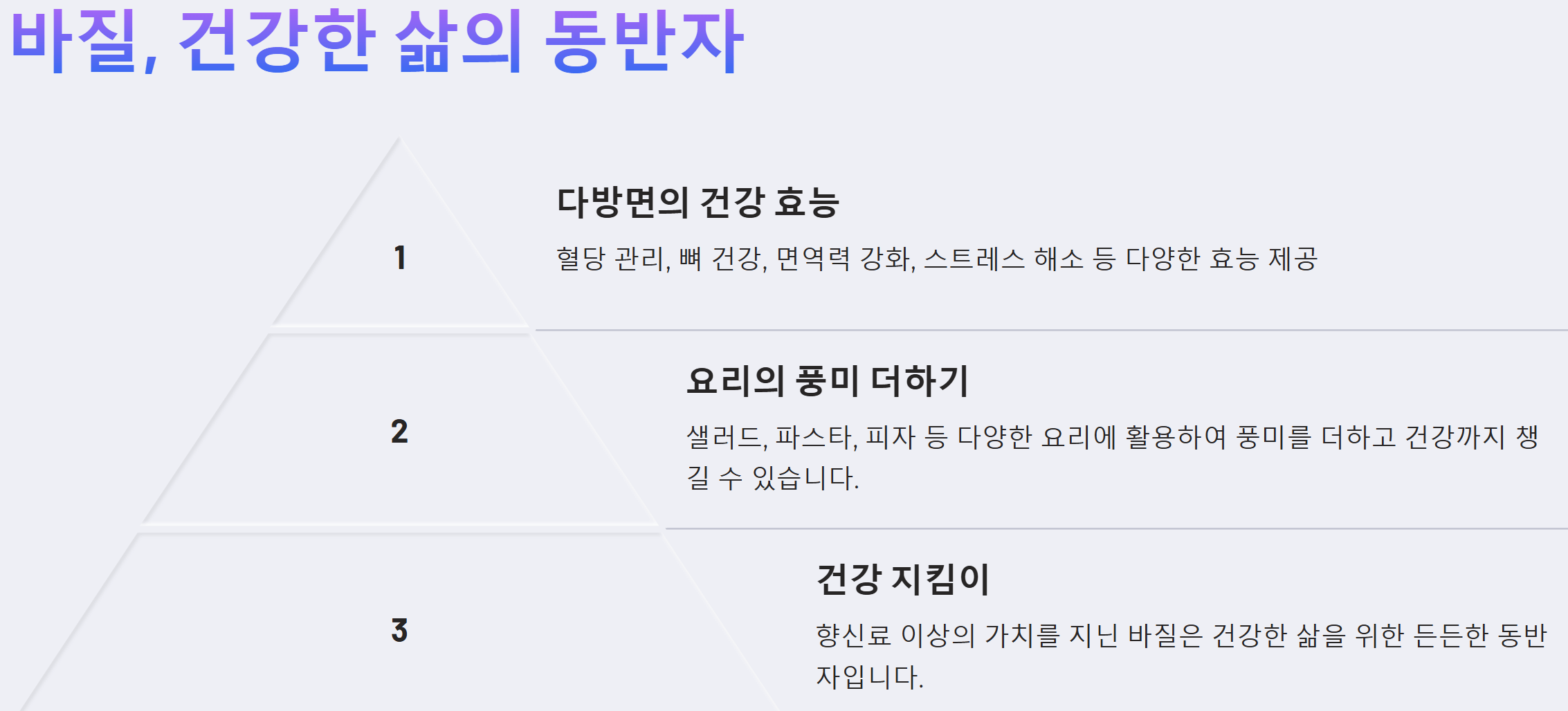 바질은 단순한 향신료를 넘어 우리 몸의 건강을 지켜주는 특별한 선물입니다. 뼈 건강, 염증 완화, 혈당 조절, 스트레스 해소 등 다양한 효능을 통해 건강한 삶을 선사합니다. 오늘부터 바질을 활용한 요리를 즐기고, 건강한 식습관을 만들어 보세요!