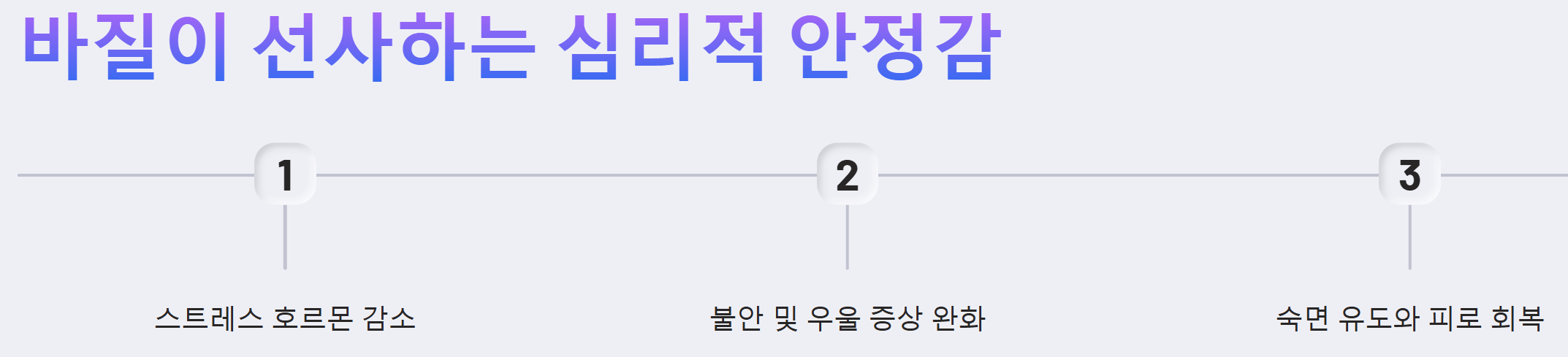 - 스트레스 완화: 스트레스 호르몬인 코르티솔 수치를 감소시킵니다.