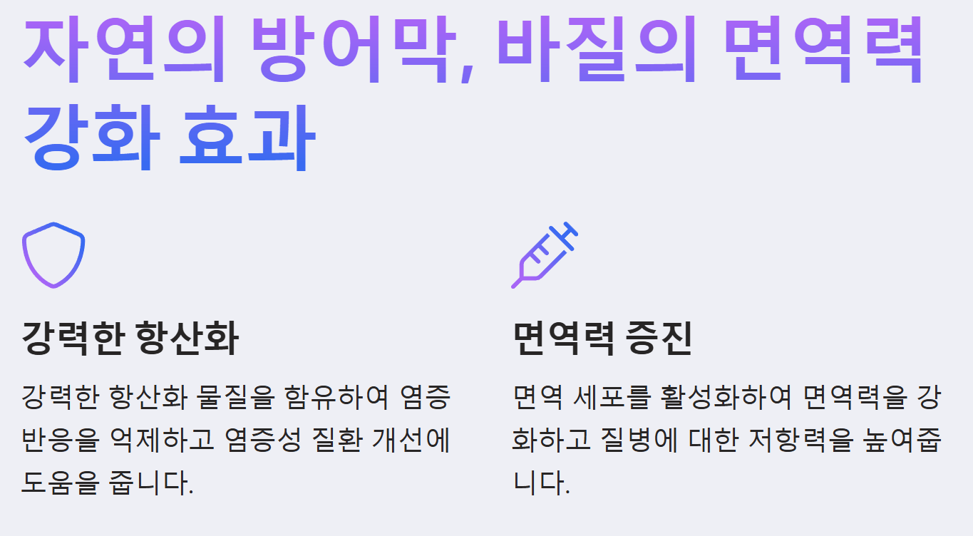 - 면역력 강화: 면역 세포를 활성화시켜 질병에 대한 저항력을 높입니다.