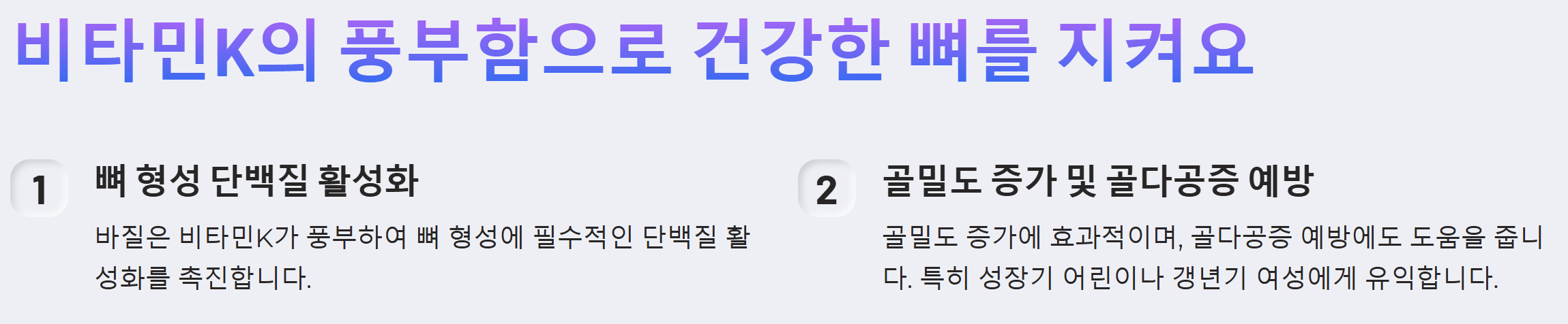 - 비타민K의 역할: 뼈 형성에 필수적인 단백질인 오스테오칼신의 활성화를 돕습니다.
