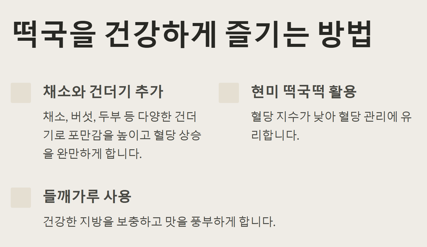 - 현미 떡국떡을 활용: 백미보다 혈당 지수가 낮고 식이섬유가 풍부한 현미 떡국떡을 사용하면 혈당 관리에 도움이 됩니다. 현미 떡국떡은 소화가 천천히 이루어져 혈당이 서서히 상승하도록 돕고, 식이섬유는 포만감을 높여 과식을 예방하는 효과가 있습니다.