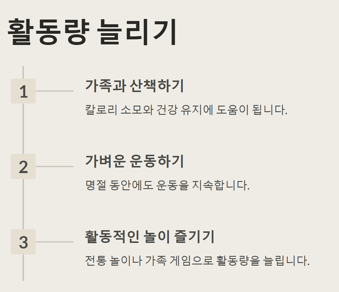 - 활동량 늘리기: 명절 기간 동안 가족과 함께 산책이나 가벼운 운동을 하면 건강 관리에 도움이 됩니다.