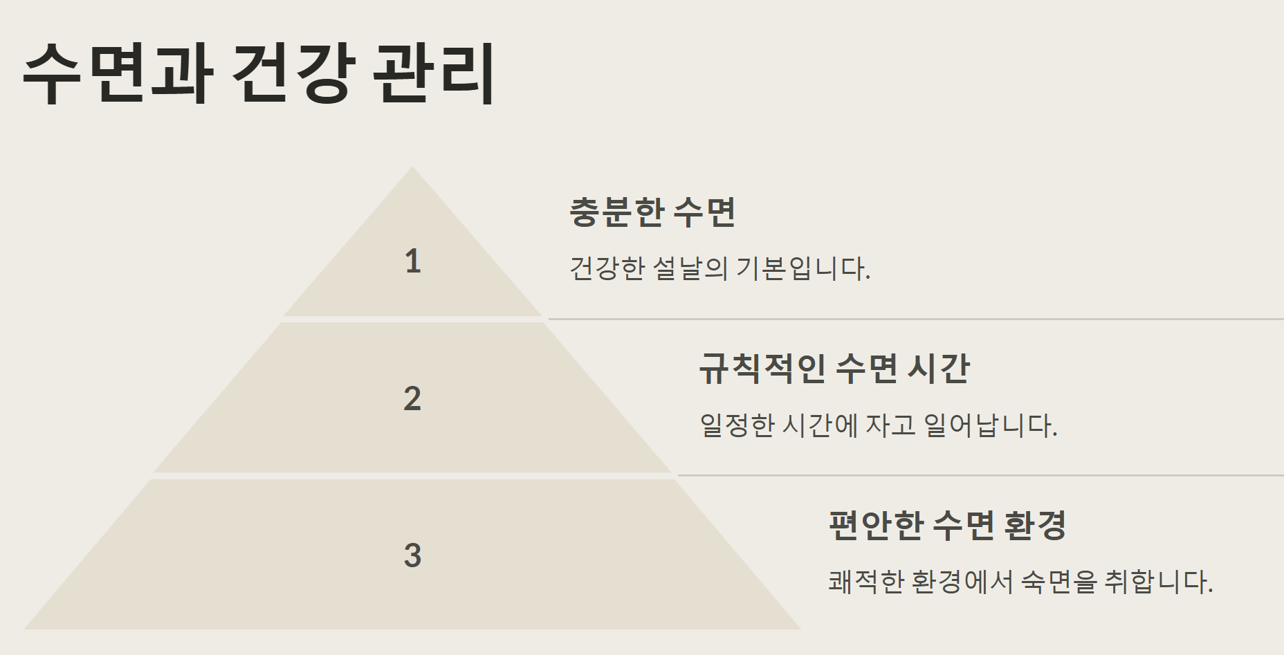 - 편안한 수면 환경: 조용하고 어두운 곳에서 편안한 침구를 사용하여 숙면을 취하세요.