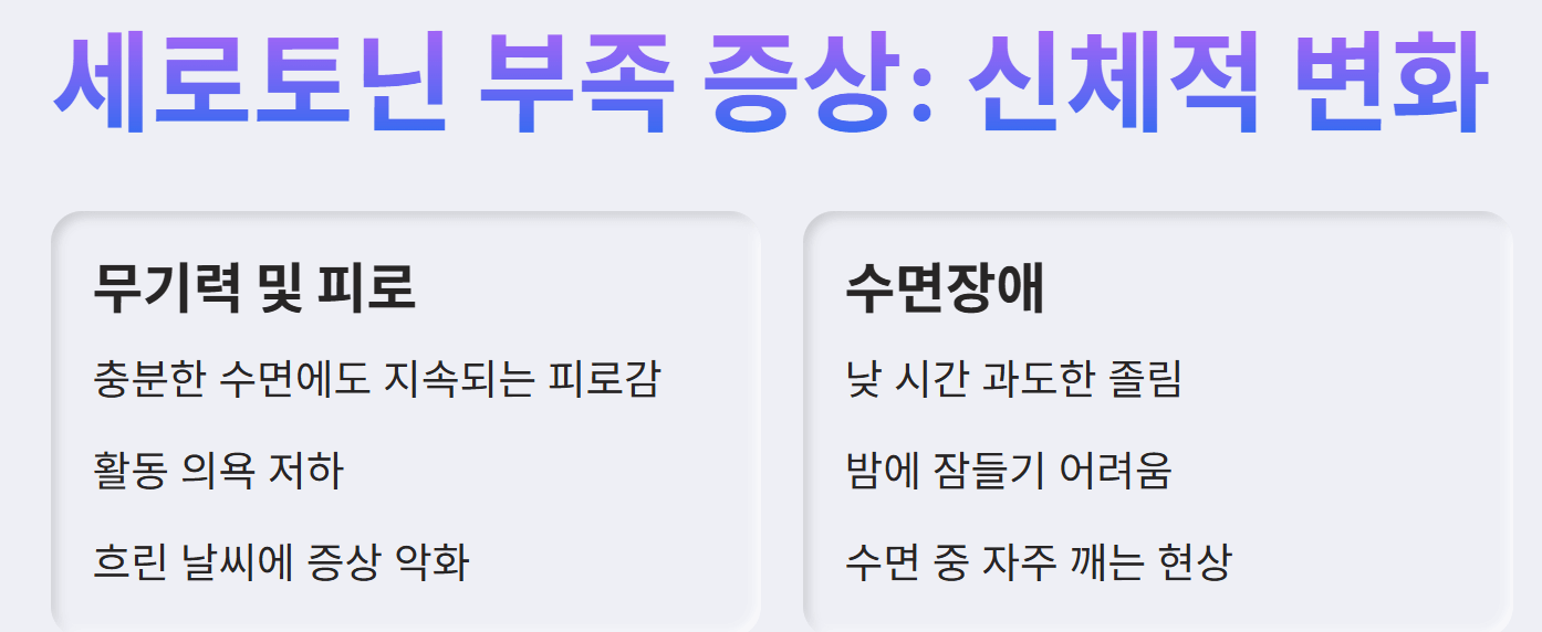 - 우울감: 이유 없는 슬픔, 외로움, 부정적인 감정이 쉽게 들며 우울증으로 이어질 수 있습니다.
