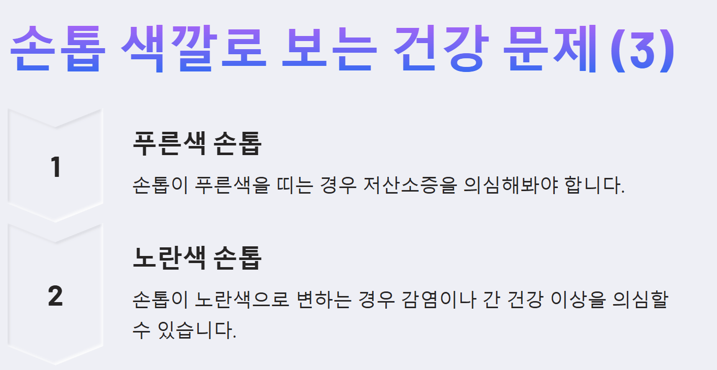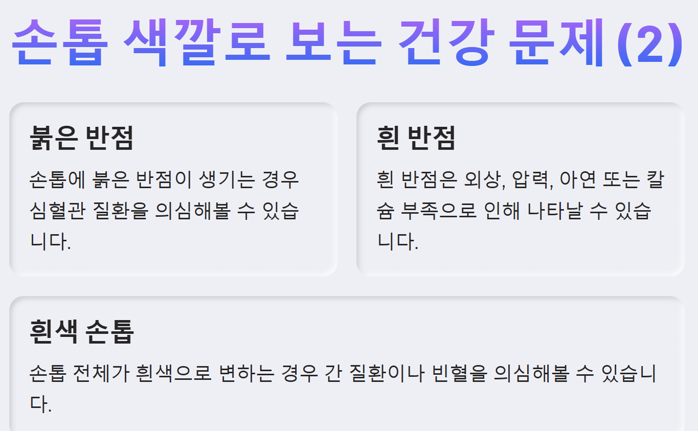 손톱에 세로줄이 뚜렷해지면 빈혈이나 관절염, 가로줄은 스트레스, 당뇨, 갑상선 이상, 신장 질환과 관련될 수 있습니다. 검은 세로줄은 색소 침착 문제인 경우가 많지만 드물게 흑색종 피부암일 수 있으며, 붉은 반점은 심혈관 질환과 관련이 있을 수 있습니다. 흰 반점은 외상이나 압력, 아연 또는 칼슘 부족으로 발생할 수 있으며, 손톱이 흰색으로 변하는 경우 간 질환이나 빈혈, 푸른빛은 저산소증, 노란색은 감염이나 간 건강 이상을 의심해볼 수 있습니다.