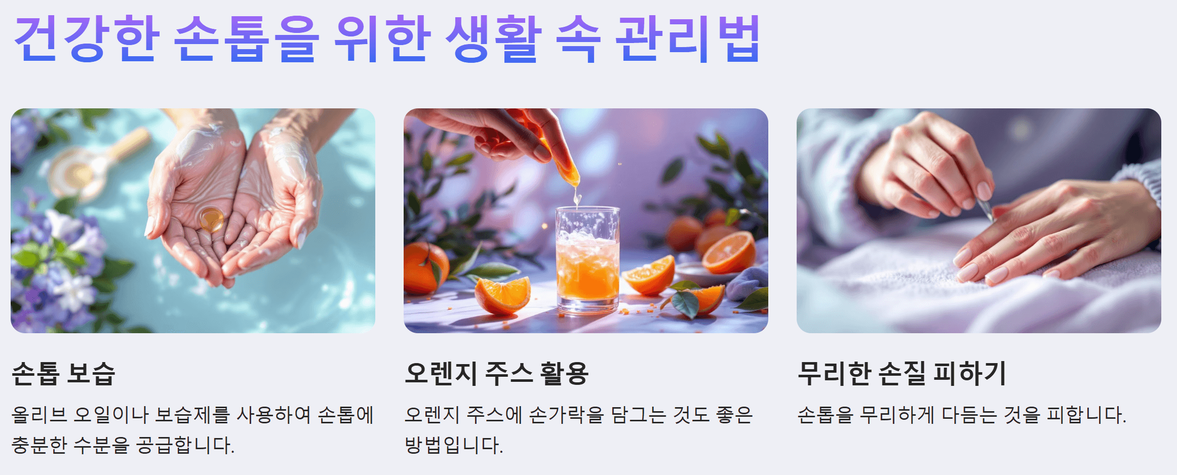 오렌지주스에 손가락을 10분 정도 담그거나 올리브오일을 손톱과 주변 피부에 발라주는 것도 손톱 건강에 도움이 됩니다. 충분한 수분 섭취와 손톱 보습제 사용은 손톱 건조를 예방하고 건강하게 유지하는 데 필수적입니다. 손톱을 너무 자주 다듬거나 무리하게 깎는 습관은 피해야 합니다!