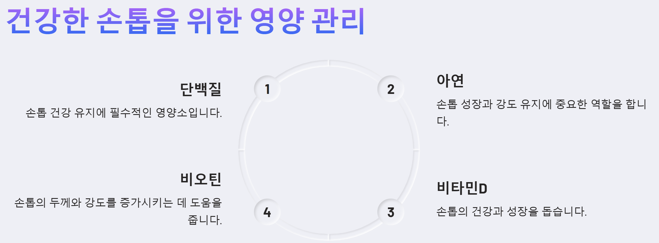 건강한 손톱을 위해서는 단백질, 아연, 비타민D 등 다양한 영양소를 골고루 섭취하는 것이 중요합니다. 특히 비오틴은 손톱을 튼튼하게 자라게 하는 데 도움을 주며, 단백질은 손톱의 주요 구성 성분입니다. 통곡물, 달걀노른자, 견과류, 연어 등 비오틴과 단백질이 풍부한 식품을 섭취하는 것이 좋습니다.