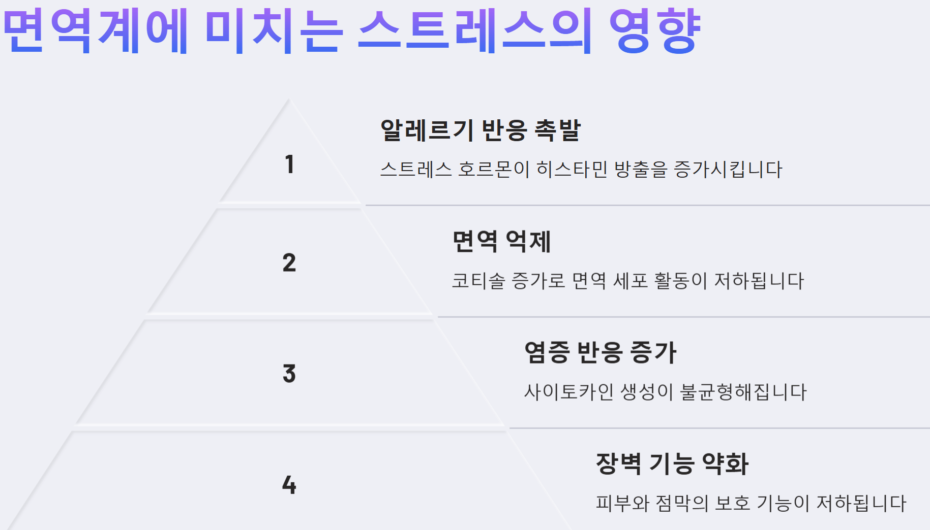 - 면역 기능 저하: 스트레스는 면역 세포의 활동을 억제하여 알레르기 유발 물질에 대한 민감성을 높입니다.
