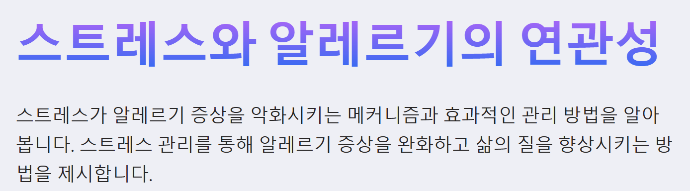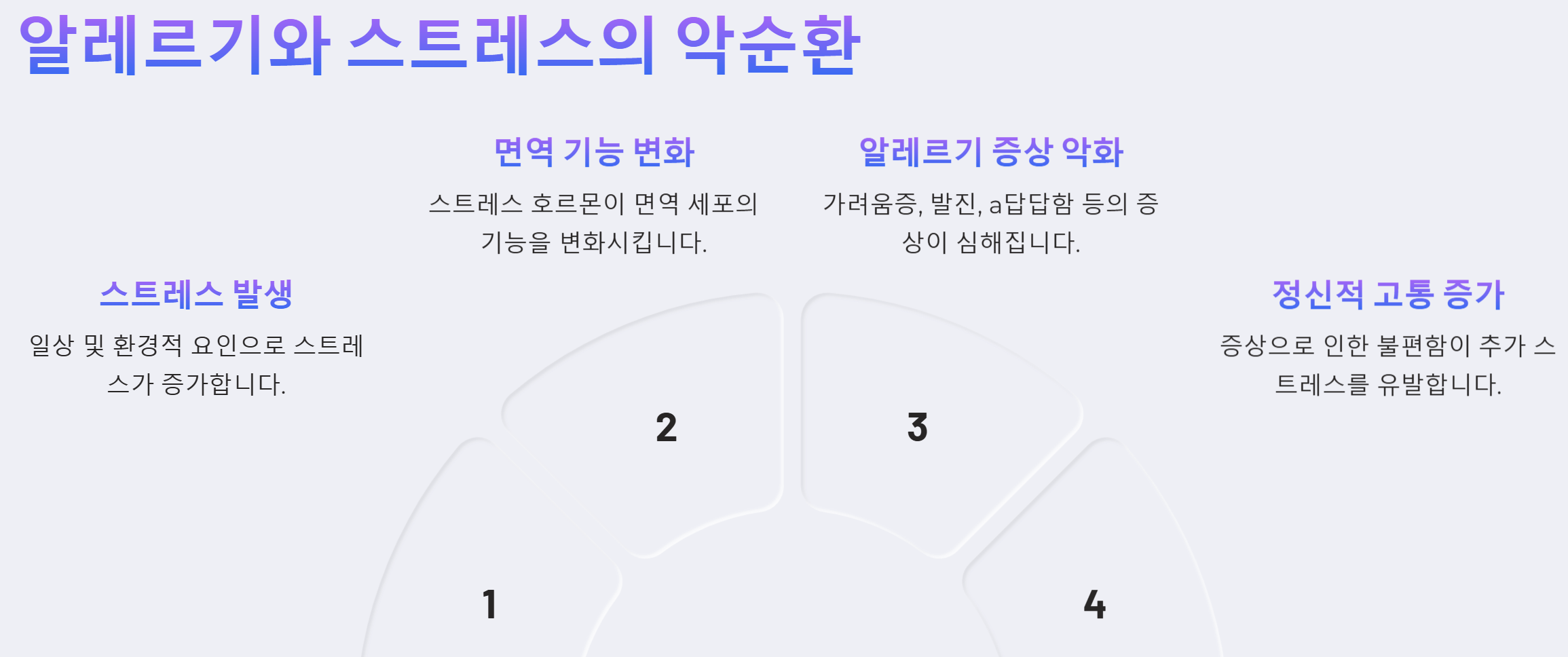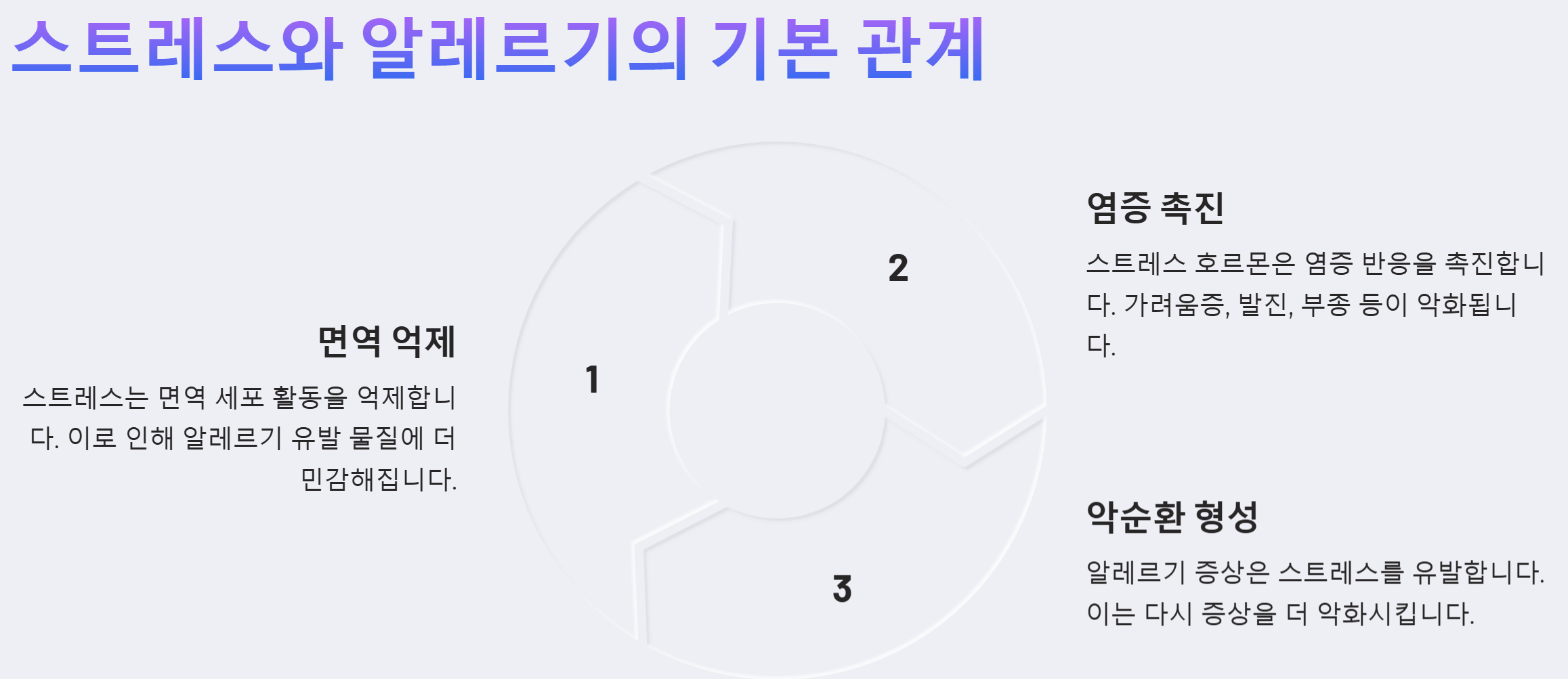 - 악순환: 알레르기 증상으로 인한 불편함과 불안감은 스트레스를 증가시키고, 이는 다시 알레르기 증상을 악화시키는 악순환으로 이어질 수 있습니다.