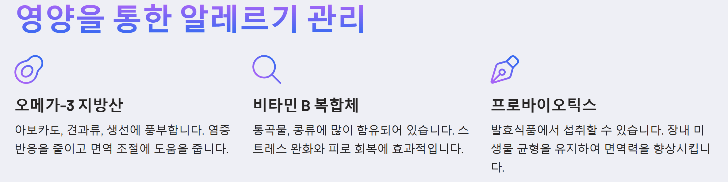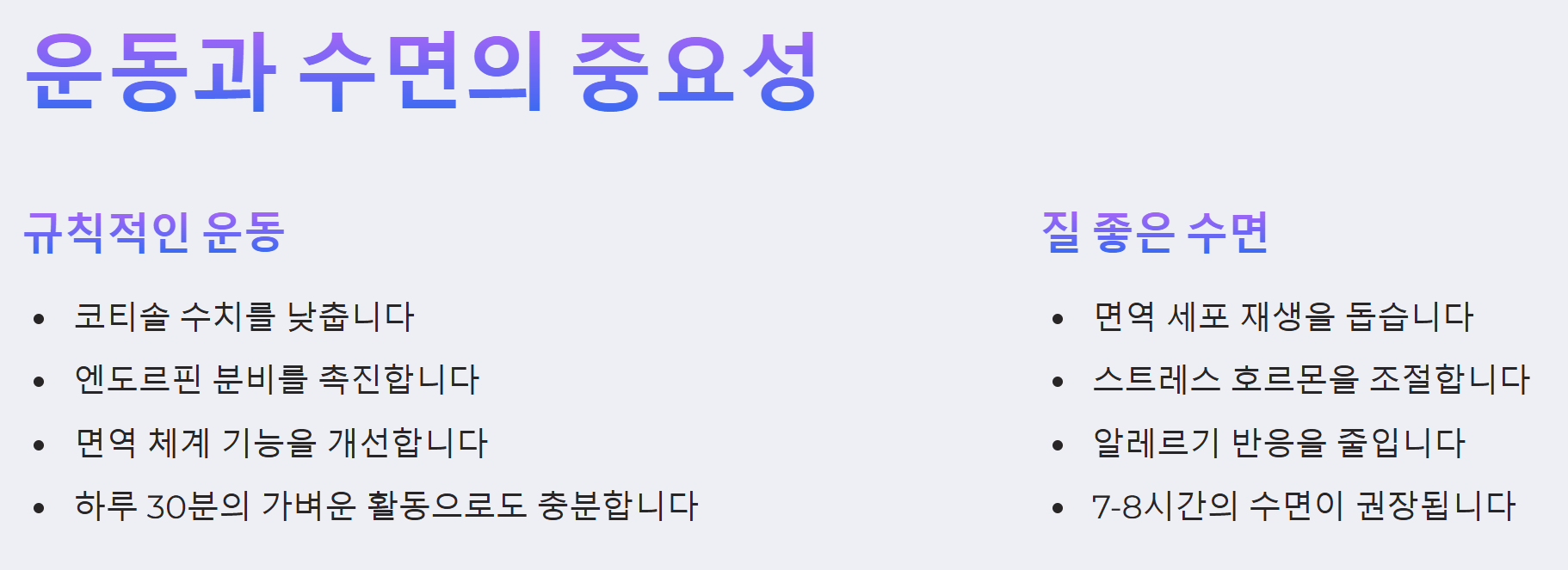 스트레스를 효과적으로 관리하는 것은 알레르기 증상 완화에 도움이 됩니다. 건강한 식습관, 규칙적인 운동, 충분한 수면은 스트레스를 줄이고 면역 기능을 강화하는 데 중요한 역할을 합니다.