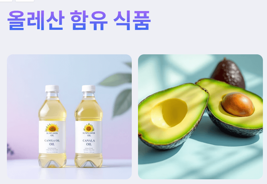 올리브유가 과다 섭취 시 비만을 유발할 수 있는 핵심 요인은 바로 올레산(Oleic acid)이라는 성분 때문입니다. 올레산 자체는 오메가-9 계열의 건강한 단일 불포화지방산으로 알려져 있지만, 올레산에 대해 주의할 점이 드러났습니다. 올레산은 우리 몸에서 지방 세포의 생성과 성장에 관여하는 특정 단백질(AKT2)의 활성을 높이고, 반대로 이를 억제하는 단백질(LXR)의 기능은 약화시키는 것으로 밝혀졌습니다. 쉽게 말해, 지방 세포를 만드는 속도를 높이고 이를 멈추는 브레이크를 고장 내는 셈입니다. 이로 인해 지방 세포가 더 빠르고 많이 축적되어 비만 위험이 커지고, 이는 결국 제2형 당뇨병이나 심혈관 질환으로 이어질 수 있습니다. 올레산은 올리브유 외에도 아래와 같은 다양한 식품에 함유되어 있습니다.