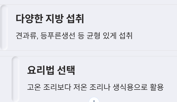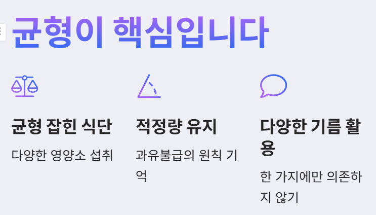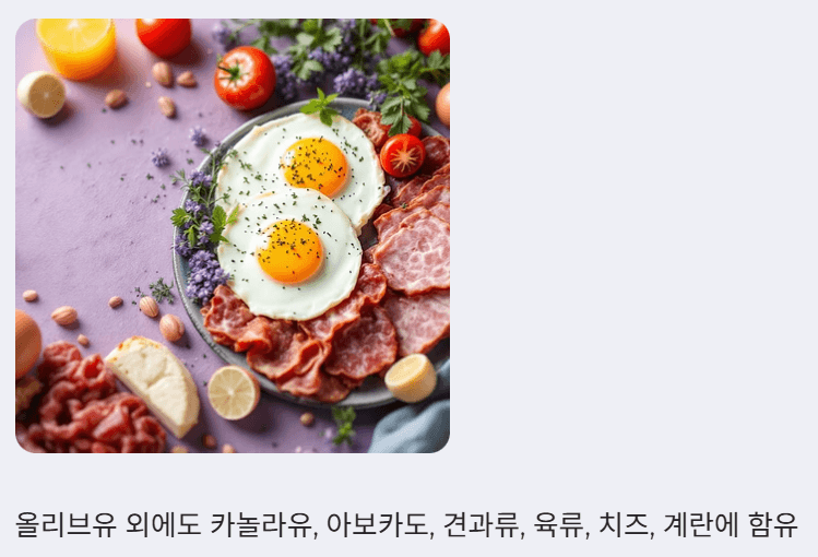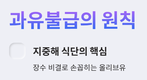 - 올리브유에만 의존하기보다 다양한 종류의 건강한 지방(견과류, 등푸른생선 등)을 균형 있게 섭취하는 것이 중요합니다.