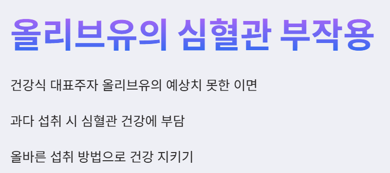 몸에 좋다는 생각에 샐러드나 요리에 듬뿍 뿌려 드시던 올리브유가 오히려 건강을 해칠 수 있다는 사실, 알고 계셨나요? 건강식의 대표주자로 여겨온 올리브유의 예상치 못한 이면에 대한 궁금증과 걱정을 해결해 드리고자 합니다. 이번에는 심혈관 건강에 안 좋을 수 있는 올리브유의 부작용에 대해 알아보겠습니다!