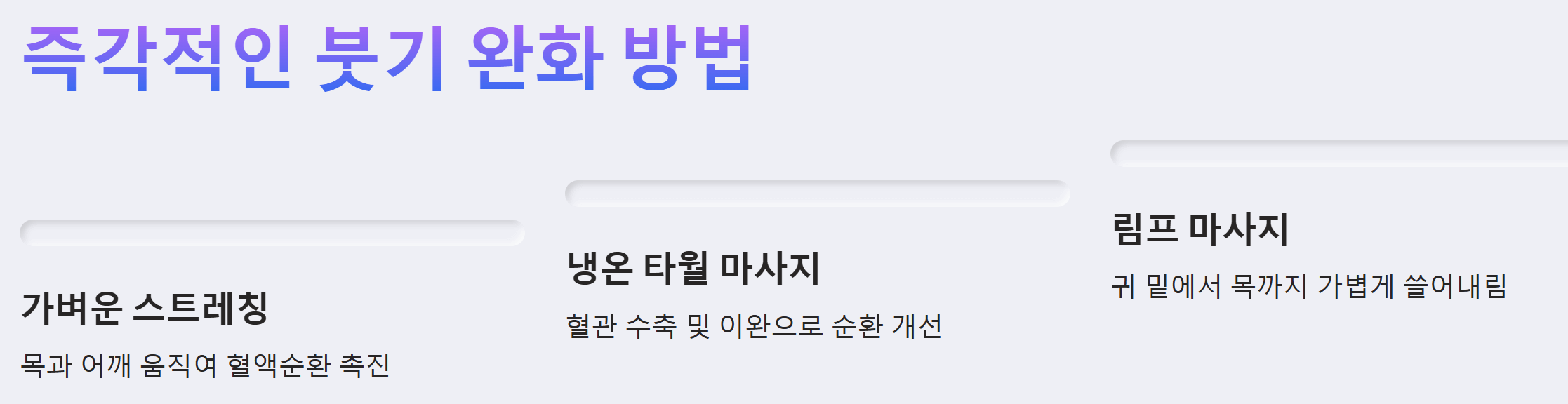 - 냉온 타월 마사지: 냉온 타월을 번갈아 사용하는 마사지는 혈관을 수축, 이완시켜 혈액순환을 개선하고 붓기를 완화하는 데 효과적입니다. 따뜻한 물에 적신 타월로 2~3분간 마사지한 후, 차가운 물에 적신 타월로 1분간 마사지하는 것을 3~5회 반복합니다.