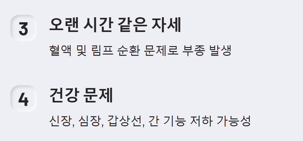 - 오랜 시간 같은 자세: 오래 앉아 있거나 서 있는 등 같은 자세를 오래 유지하면 혈액순환이 원활하지 않아 붓기가 생길 수 있습니다. 특히 다리에서 심장으로 체액을 올려보내는 정맥 내 판막 기능이 떨어지고 미세 림프관이 막혀 부종이 생길 수 있습니다. 1시간마다 10분씩 스트레칭을 하거나 가볍게 걷는 것이 좋습니다.