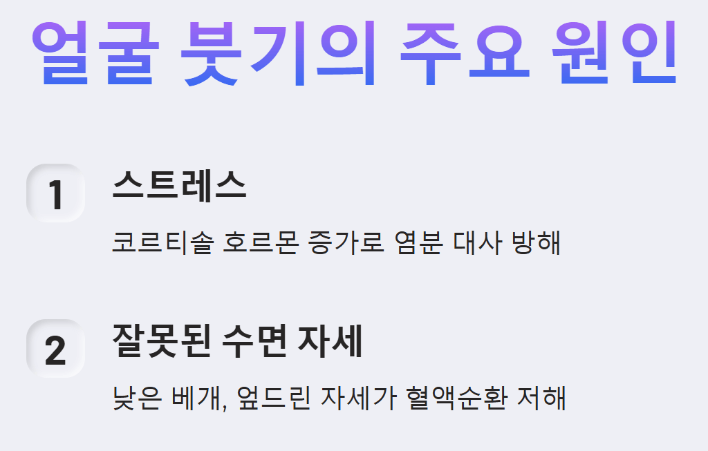- 스트레스: 스트레스는 만병의 근원이죠. 코르티솔 호르몬은 콩팥 위에 있는 부신에서 분비되며, 체내 염분 대사를 방해하여 얼굴을 붓게 만듭니다. 특히, 만성적인 스트레스는 코르티솔 수치를 지속적으로 높여 부종을 악화시킬 수 있습니다.