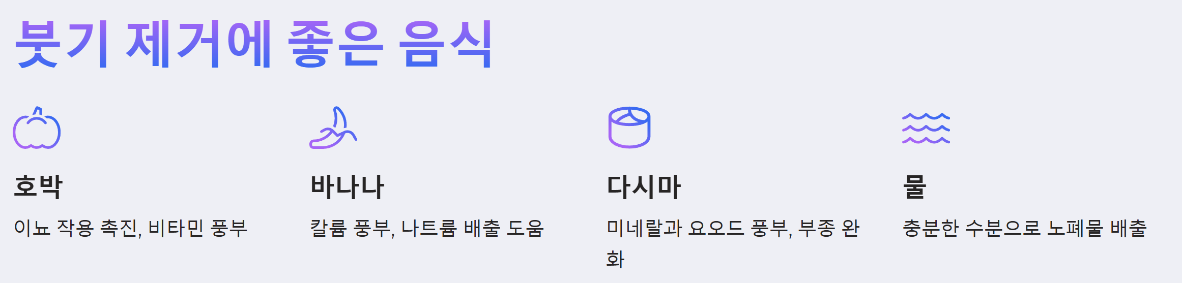 - 붓기 제거에 좋은 음식 섭취: 붓기 제거에 효과적인 음식을 섭취하는 것도 좋은 방법입니다. 호박, 바나나, 다시마, 미역, 셀러리, 아스파라거스 등은 이뇨작용을 활발하게 하여 붓기 제거에 도움을 줍니다. 특히, 칼륨이 풍부한 바나나는 나트륨 배출을 도와 붓기 완화에 효과적입니다.