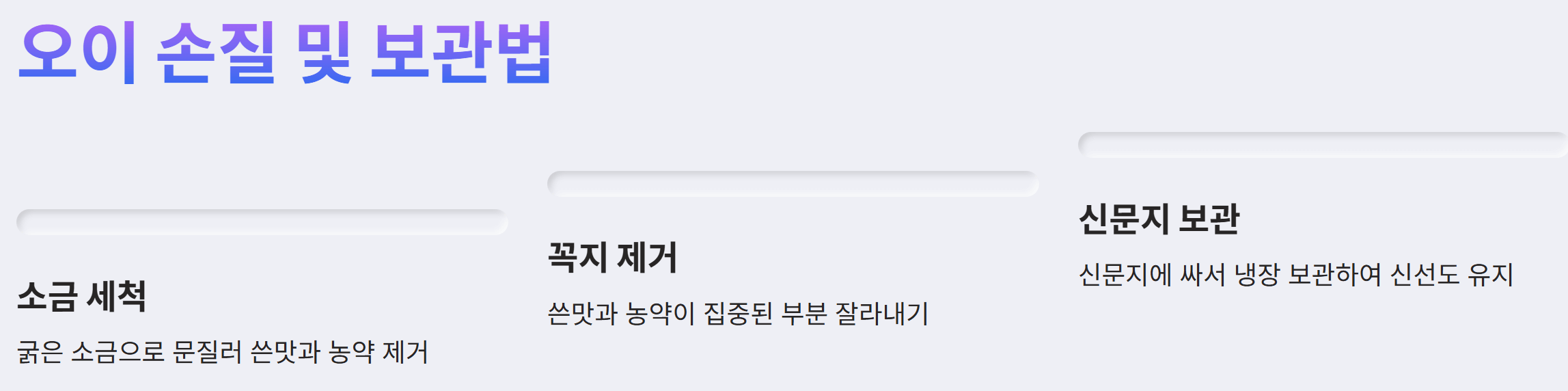 - 선택 요령: 꼭지가 마르지 않고 색이 선명하며 통통한 오이를 고르는 것이 좋습니다. 반으로 잘랐을 때 씨가 없는 것이 신선한 오이입니다.