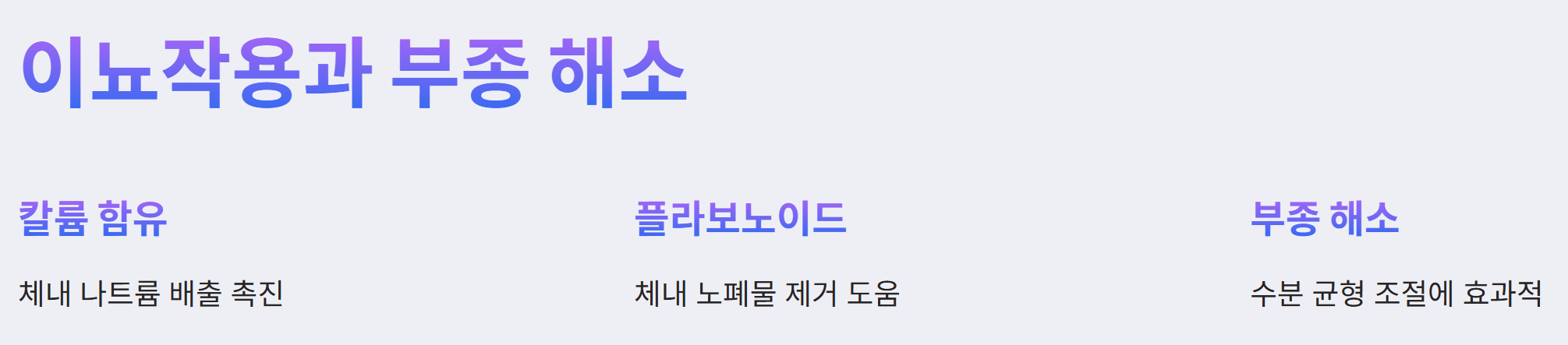 - 이뇨작용 촉진: 칼륨과 플라보노이드가 풍부해 체내 노폐물과 나트륨 배출을 도와 부종 해소에 좋습니다.