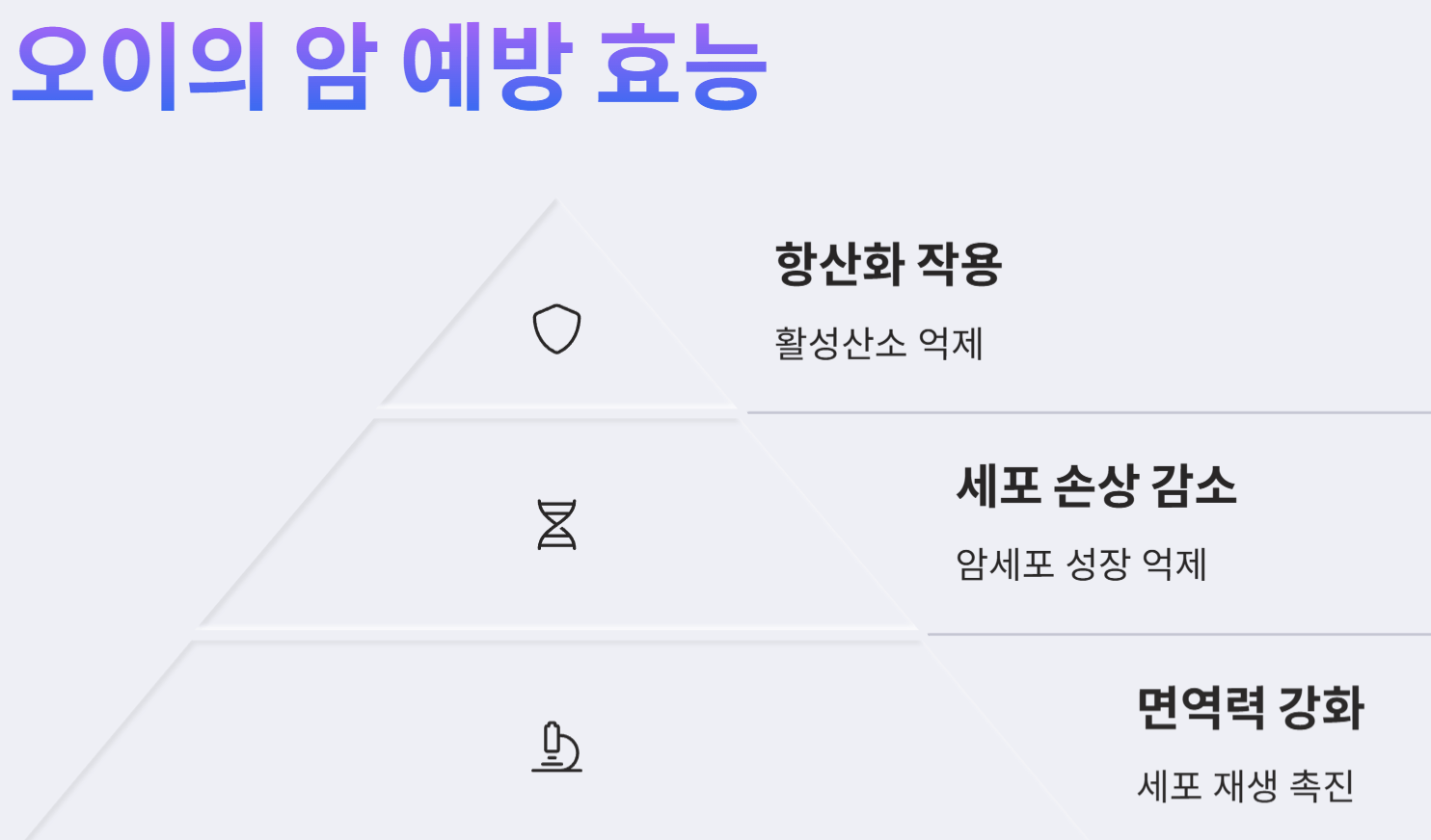 항산화 성분이 중요해진 이유는 체내의 많은 활성산소가 암을 유발하기 때문입니다.오이는 항산화 작용을 하는 다양한 성분을 포함하고 있어 암 예방에 도움을 줍니다. 활성산소를 억제하는 피세틴, 카로틴 등의 항산화 성분이 세포 손상을 줄여 암세포 성장 억제에 기여합니다.