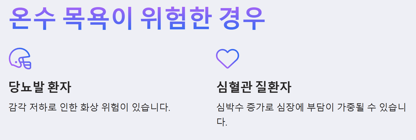 ※ 따라서 기저질환이 있는 경우에는 주치의와 상담 후 온수 목욕을 하는 것이 바람직합니다.