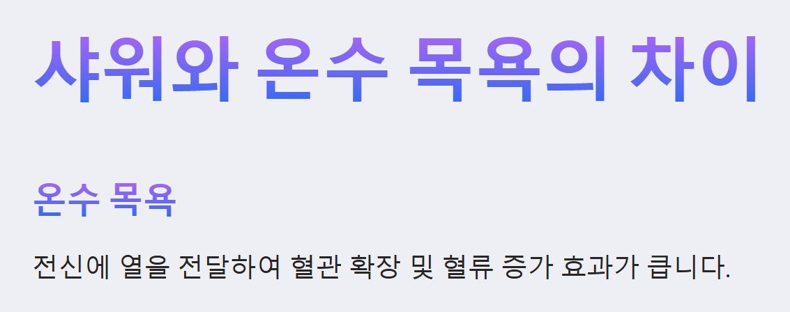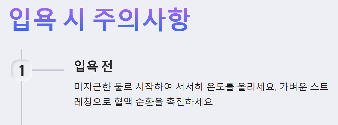 - 뜨거운 물에 갑자기 들어가지 말고, 미지근한 물로 시작하여 천천히 온도를 높이는 것이 좋습니다.