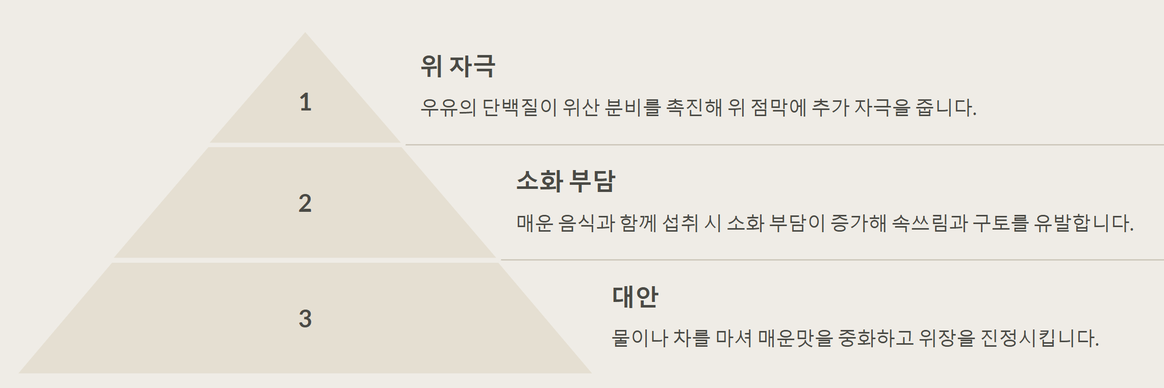 - 소화 부담 증가: 매운 음식과 우유를 함께 섭취하면 소화 부담이 증가하여 속쓰림, 구토 등을 유발할 수 있습니다.