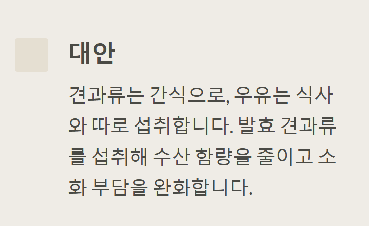 - 발효 견과류 섭취: 발효 과정을 거친 견과류는 수산 함량이 감소하여 칼슘 흡수를 방해할 가능성이 적으며, 다양한 효소를 함유해 소화를 돕고 우유와 함께 섭취해도 상대적으로 안전합니다.