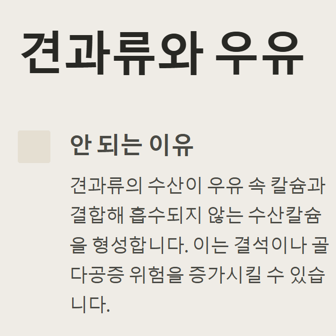 - 수산칼슘 형성: 견과류에 함유된 수산(옥살산)은 우유 속 칼슘과 결합하여 수산칼슘을 형성합니다. 수산칼슘은 체내에서 결석을 형성할 수 있으며, 칼슘 흡수를 방해하여 골다공증의 위험을 높일 수 있습니다.