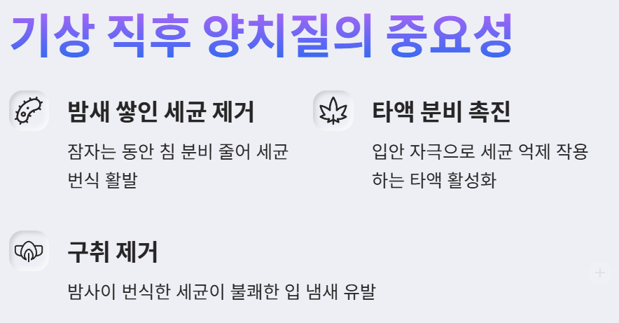 - 구취 제거: 밤사이 번식한 세균은 불쾌한 입 냄새의 주요 원인이 됩니다. 기상 직후 양치질은 상쾌한 아침을 맞이할 수 있도록 도와줍니다.