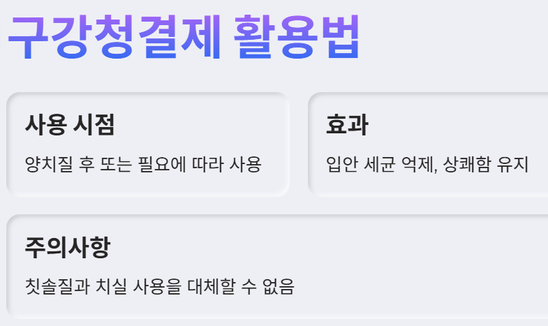 - 구강청결제 사용법: 양치질 후나 필요에 따라 적정량의 구강청결제로 입안을 헹굽니다. 구강청결제는 입안의 세균을 억제하고 상쾌함을 유지하는 데 도움을 줄 수 있습니다. 다만, 구강청결제는 칫솔질과 치실 사용을 대체할 수 없다는 점을 명심해야 합니다.