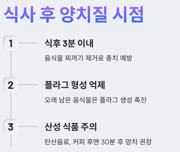 아침 식사 후의 양치질은 입안에 남아있는 음식물 찌꺼기를 제거하여 충치 발생 위험을 줄이는 데 매우 중요합니다. 식후 3분 이내 칫솔질은 치아 건강을 지키는 기본적인 원칙이며, 건강한 구강 환경을 유지하는 데 필수적인 습관입니다.