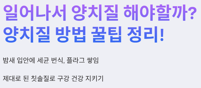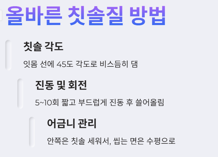 - 주의사항: 너무 세게 힘을 주어 닦으면 잇몸이 손상될 수 있으므로, 부드럽게 닦는 것이 중요합니다.