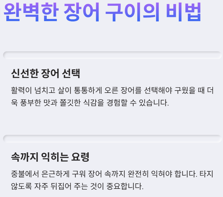 - 속까지 익히는 요령: 초벌구이 후에는 중불에서 은근하게 구워 장어 속까지 완전히 익혀야 합니다. 타지 않도록 자주 뒤집어 주는 것이 중요하며, 속까지 골고루 익었는지 확인하며 조리합니다. 이 과정에서 장어의 지방이 적절히 녹아내리면서 고소한 맛을 더합니다.
