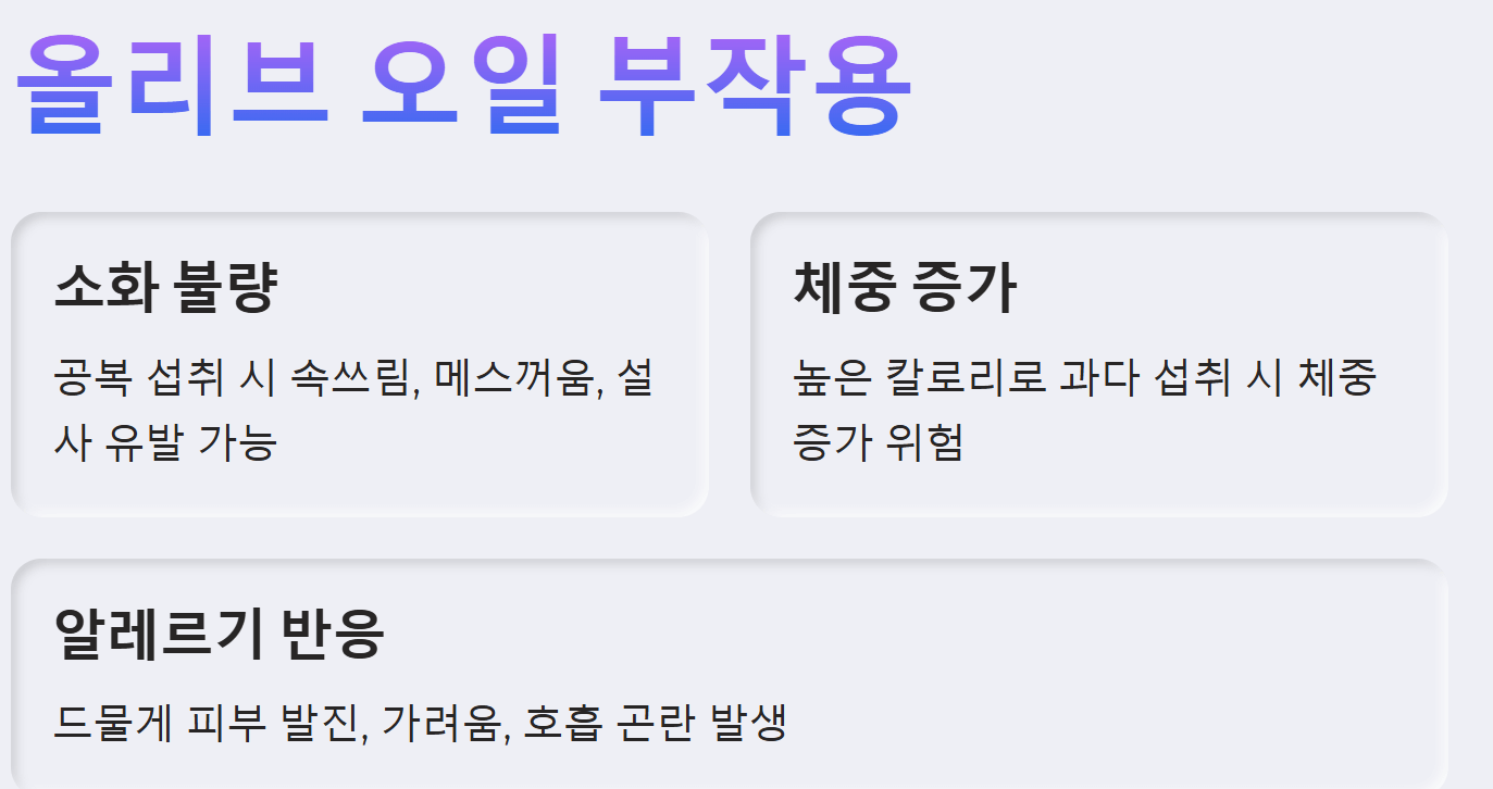 - 개인별 알레르기 반응: 드물게 올리브 오일에 대한 알레르기 반응을 보이는 사람도 있을 수 있습니다. 올리브 오일 섭취 후 피부 발진, 가려움, 호흡 곤란 등의 증상이 나타난다면 즉시 섭취를 중단하고 의료기관을 방문해야 합니다.