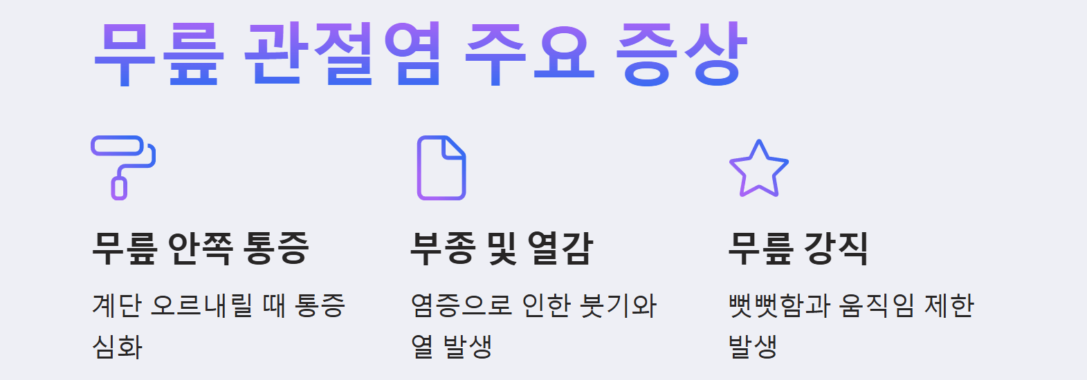 - 무릎 부종 및 열감: 무릎이 붓거나 열감이 느껴진다면 염증이 발생했을 가능성이 높습니다.