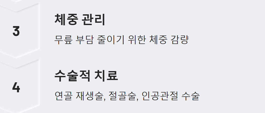 - 적절한 체중 유지: 과체중은 무릎에 부담을 주어 관절염을 악화시키므로 적절한 체중을 유지해야 합니다.