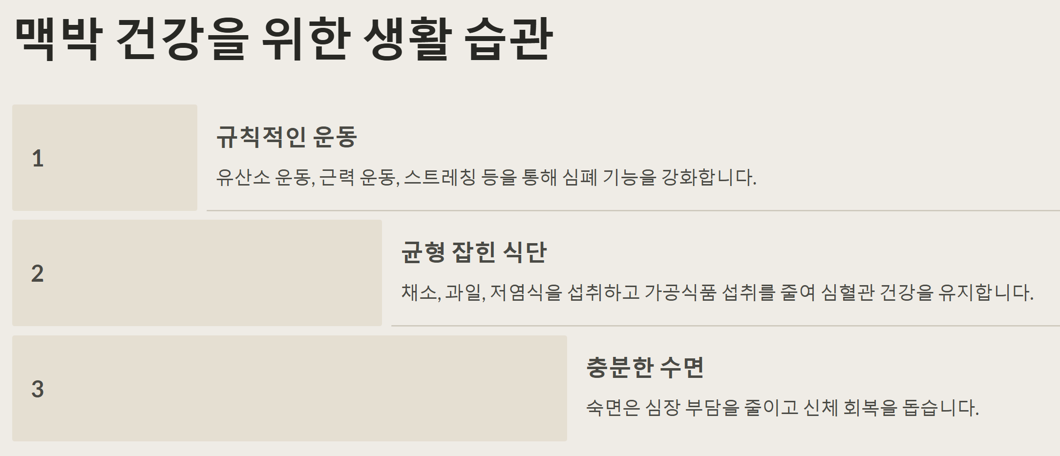 - 7-8시간 수면: 충분한 수면은 심혈관 건강을 유지하는 데 필수적입니다.