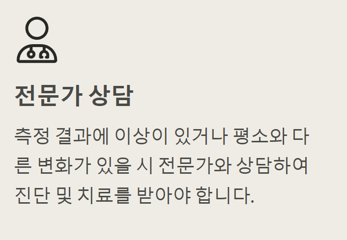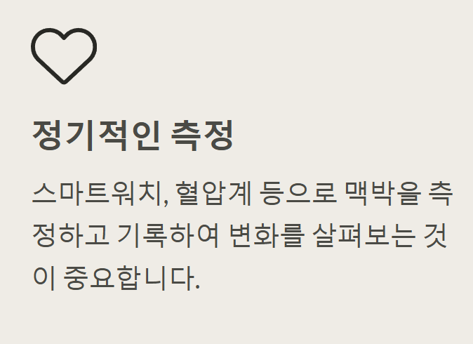 - 심박수 측정 방법: 스마트 워치, 혈압계 등 다양한 기기를 활용하여 심박수를 측정할 수 있습니다. 측정 시에는 편안한 자세로 앉거나 누워서 측정하고, 측정 전후 10분 정도는 안정을 취하는 것이 좋습니다.