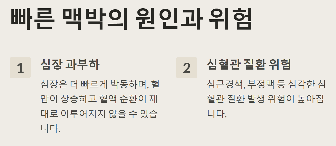 - 심장에 과부하: 맥박이 빠르면 심장이 더 빠르게 수축하면서 혈액을 펌프해야 하므로 심장에 부담이 가중됩니다. 이는 심근경색, 부정맥 등 심장 질환의 위험을 높일 수 있습니다.