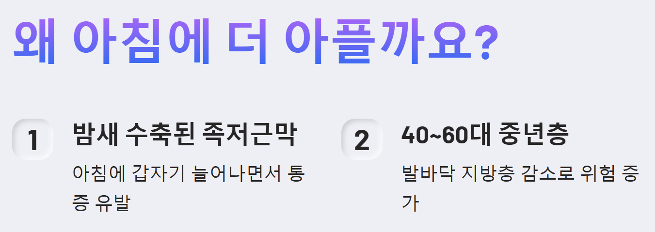 족저근막염은 특히 아침에 일어났을 때 통증이 심하게 나타나는 특징이 있습니다. 그 이유는 잠자는 동안 족저근막이 뻣뻣하게 수축되어 있다가, 아침에 첫 발을 디딜 때 갑자기 늘어나면서 통증이 발생하기 때문입니다. 마치 오랫동안 웅크리고 있던 고양이가 갑자기 일어나는 것과 비슷하다고 생각하시면 됩니다.