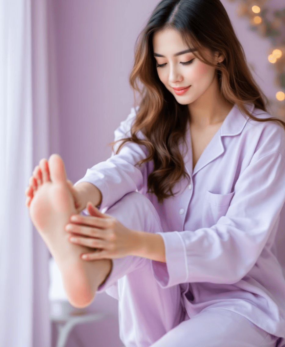 - 발뒤꿈치를 최대한 내린 상태에서 한 손으로 발가락을 잡고 뒤로 젖혀줍니다. 이때 발바닥에 딱딱하게 만져지는 막이 족저근막입니다.
