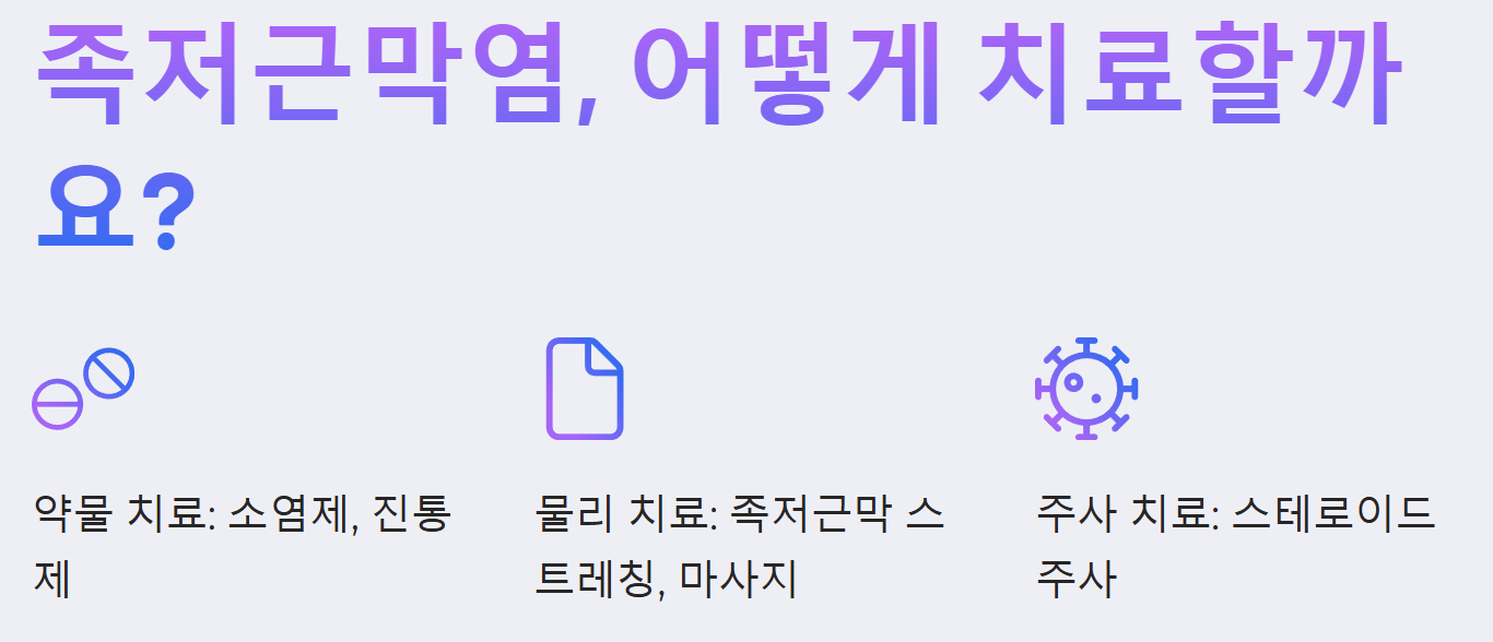 보존적 치료에도 통증이 지속되면 주사 치료, 체외충격파 치료 등 비수술적 치료를 시행해 볼 수 있습니다. 하지만 이러한 치료에도 효과가 없다면 수술적 치료를 고려해야 합니다. 최근에는 스테로이드 주사 대신 PDRN 주사를 통해 족저근막의 염증을 줄이고 통증을 완화하는 치료법도 사용되고 있습니다.