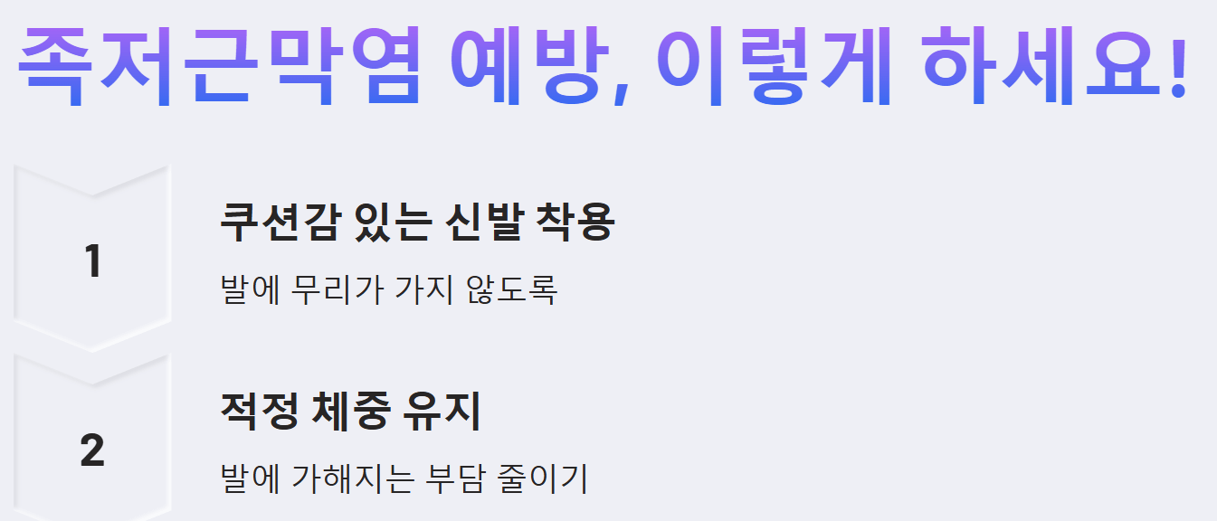 족저근막염을 예방하려면 평소 발이 너무 꽉 끼지 않고 쿠션감이 있는 편안한 신발을 신는 것이 중요합니다. 적정 체중을 유지하며 무리한 운동을 피하는 등 발바닥에 가해지는 충격을 최대한 줄이는 것이 좋습니다. 발바닥 마사지, 발바닥과 종아리 스트레칭을 통해 유연성을 늘려주는 것도 도움이 됩니다.
